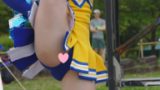 野外イベントでお馴染みのママさんチアチームによる演技を撮影したものです。このチームは毎回演技するメンバーが違い楽しみのひとつになっています。お揃いのTシャツに定番の黒パンツスタイルでハイキックを中心にダンスを披露しています。静止画でご覧ください。
