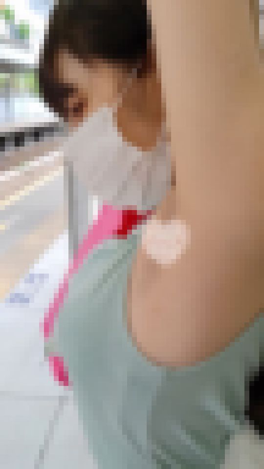 無防備にノースリーブでつり革を掴むことで丸出しになった腋に近付いてみると、その大人しい顔とはあまりにもギャップが有り過ぎる無造作なジョリ腋に仰天。